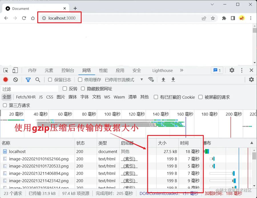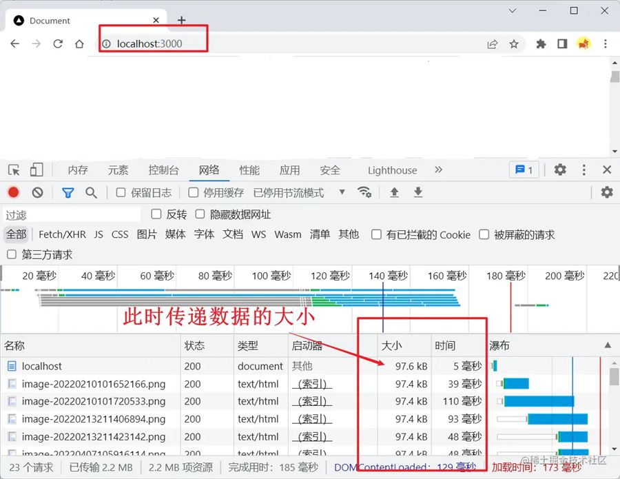 可以看到我这里传递的数据大小是97.6kb(这取决于你的index.html的内容)