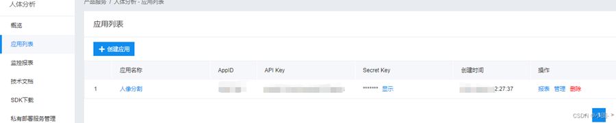 创建完成在应用列表记录 API Key、Secret Key的值 ,稍后要用。