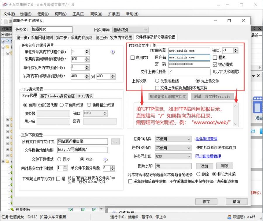 火车头简要来讲分为 3 个部分的配置:1、发布地址配置;2、文件保存地址与图片附件前缀配置;3、linux 主机 FTP 自动上传配置。下面举例说明一下: