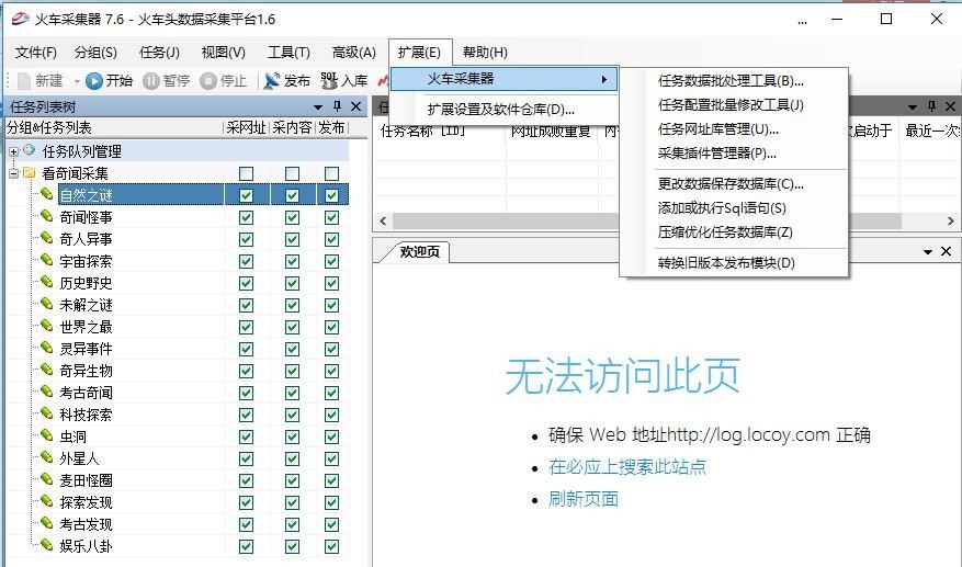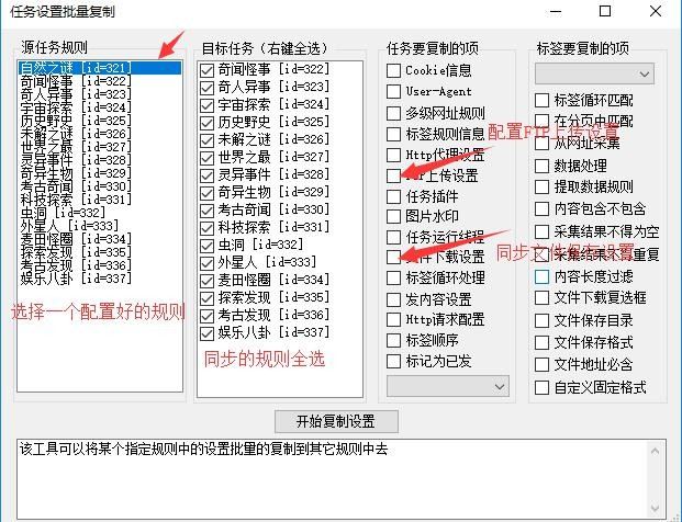 同个网站采集如果规则非常多,需要一个一个改是本当麻烦的,哪么可以用火车的同步配置,相当简便如前面的,只要配置好一个规则,其它配置都可以同步(任务配置批量修改工具):