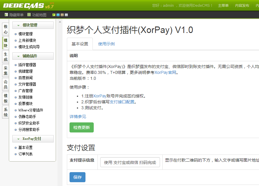 此为DedeCMS织梦个人支付插件XorPay,支持支付宝和微信支付,实现网站的付费可见、会员充值、金币充值等功能。