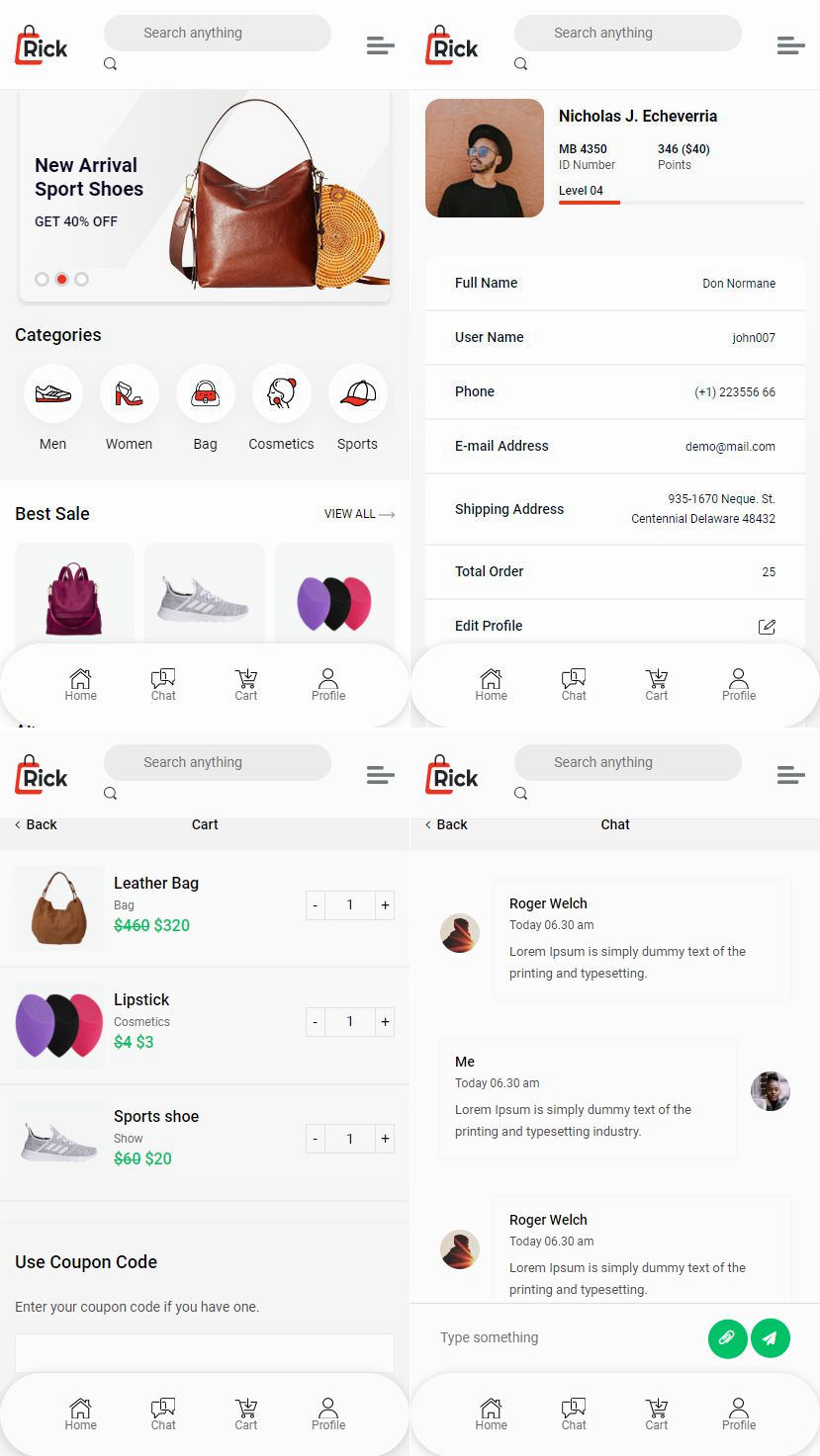 HTML5移动端电子商务网站模板基于Bootstrap4.4.1制作,WAP页面,全套模板,包括购物车、聊天、联系、编辑个人资料、登录、通知、订购、个人资料、注册、搜索、店铺、商品、愿望清单等商城模板页面。
