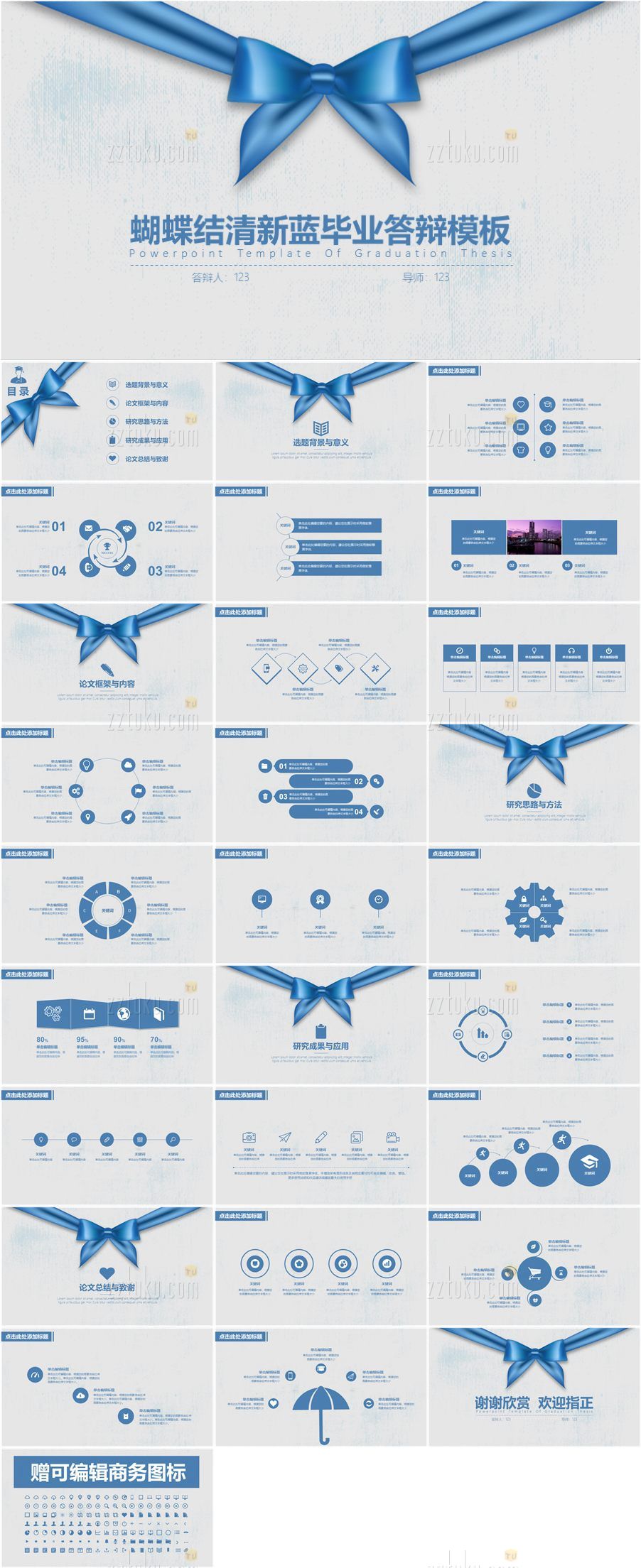 转载请声明来自:站长图库 - 蝴蝶结清新蓝毕业答辩PPT模板使用声明: