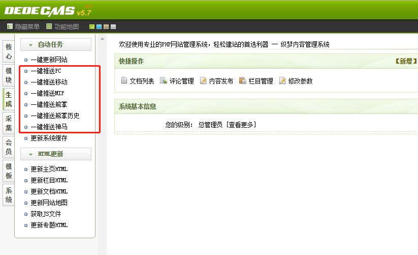 织梦DedeCMS网站一键推送功能有利于搜索引擎蜘蛛在第一时间抓取到网站的最新内容,加快收录速度。