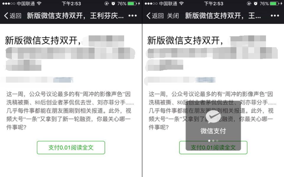 其实这个开发原理很简单,无非就是在文章页面加一个微信支付的按钮,点击支付后把隐藏的部分给显示出来或者直接跳转到全文地址。