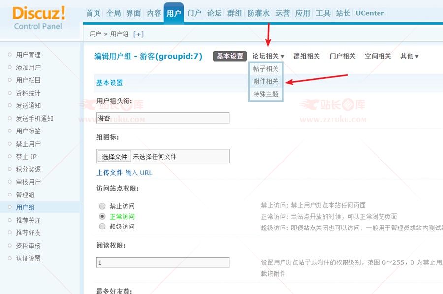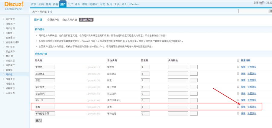 首先也是登录管理后台—点击“用户”—“用户组”—“系统用户组”—找到“游客”—点击编辑。
