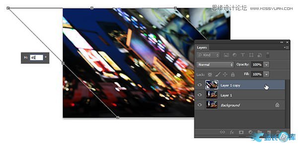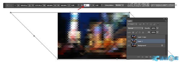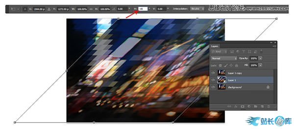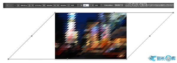 9、用自由变换工具(Ctrl + T)让图像水平倾斜45度。