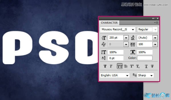 创建使用全部大写字体Mousou记录ĝ色白中的文本。大小是255 pt和"跟踪"的值设置为100,以创造更多的字母之间的空间。