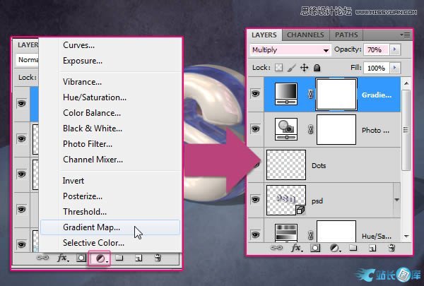 再次点击"创建新的填充或调整图层"图标,这时候选择渐变映射。然后改变调整图层的混合模式为正片叠底,不透明度为70%。