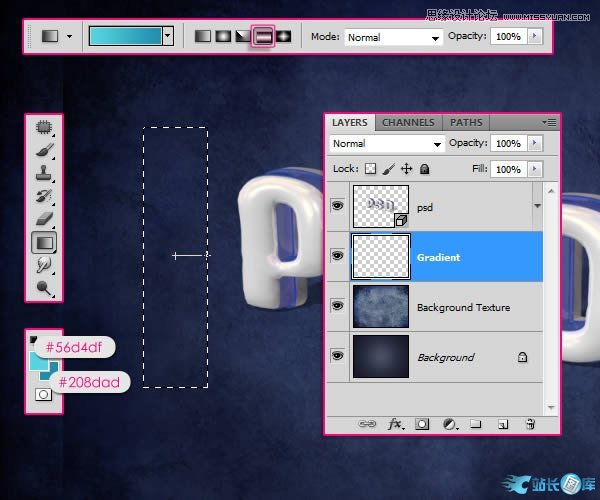 3D层下方创建一个新层,并称之为"梯度"。设置前景色为#56d4df和背景颜色#208dad,选择"渐变"工具,选择前景色到背景梯度,并在选项栏中单击"反射梯度图标。然后,点击选择的中心和拖动之一两侧。