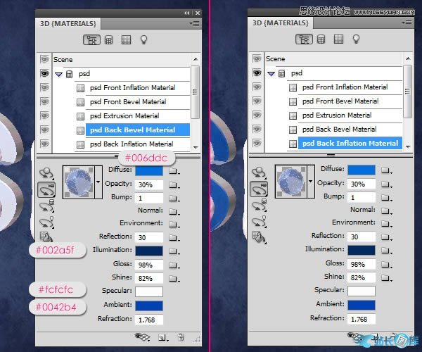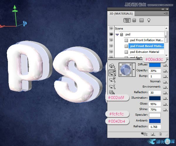 选择前斜面材料,然后更改漫反射颜色#006ddc,不透明度为30%,思考30,照明颜色#002a5f,发光,95%,70%的服务,镜面颜色# fcfcfc,环境色为#0042b4,并折射到1.768。