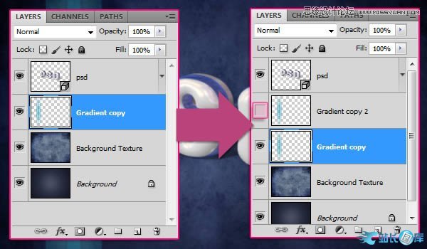 同时选择渐变层,去图层>合并图层,然后复制合并后的新层。复制合并层无形的,通过点击它旁边的眼睛图标。
