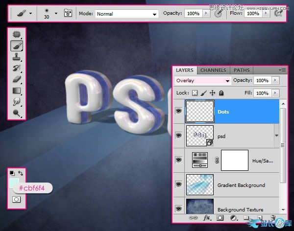 设置前景色为#cbf6f4和挑一个30像素的软轮刷,然后所有层的顶部创建一个新层,称之为"点",改变其混合模式为叠加。