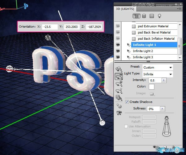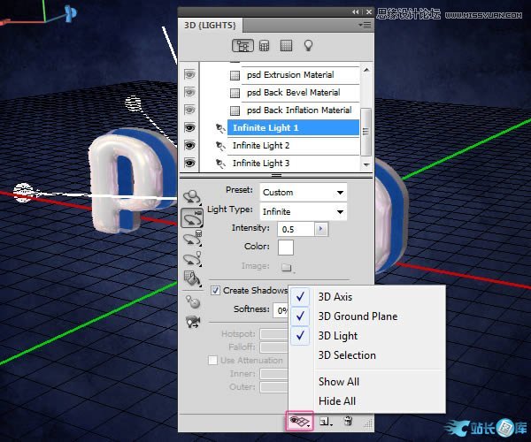 点击"切换其他3D额外"图标向下3D面板和检查的"3D光"的选项,你可以勾选"3D",以及地平面。这样你就可以看到场景中的3D灯的位置如何。