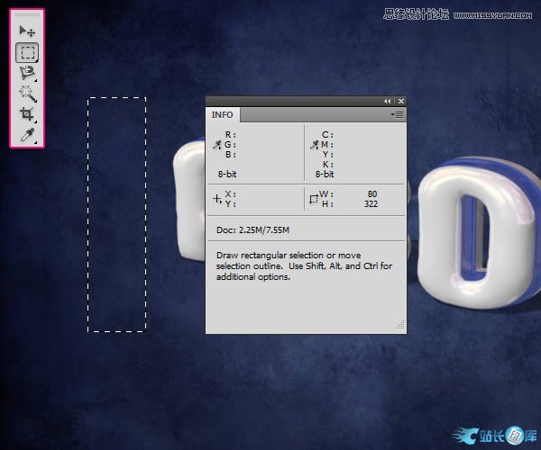 一旦渲染完成后,挑矩形选框工具,绘制一个80×322像素的矩形的任意空白区域,但尽量保持垂直居中的选择。您可以检查测量中的"信息"面板("窗口">"信息"),或者你可以创建一个固定大小的选择。