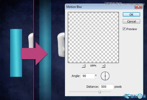 去选择>取消选择摆脱。然后去滤镜>模糊>动感模糊,设置角度为90,距离为500。