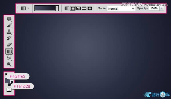 创建一个新的1024×768像素的文件,或者任何你需要的大小取决于你将创建的文本。然后,设置前景色为#4a4f65和背景颜色为#161a28,径向渐变填充背景(从中心到边角之一)。
