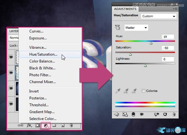 下来"图层"面板中点击"创建新的填充或调整图层"图标,选择"色相/饱和度,并改变色相值19和饱和值-50。