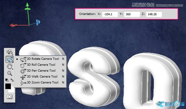 从工具箱中,使用相机的工具来改变相机的角度(视图),因为我们不想改变网格的位置。一旦你选择相机的工具,你可以点击和拖动来更改值,或这样做,你可以简单地使用3D轴。如果你想,你可以在选项栏中取向字段输入一些精确值。