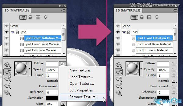选择前通胀材料开始修改它的值。首先,你需要摆脱漫纹理,如果有一个。要做到这一点,单击"漫反射纹理图标,然后选择删除纹理。你需要做同样的事情,以及作为其他材料的质地可能隐藏任何应用的颜色。