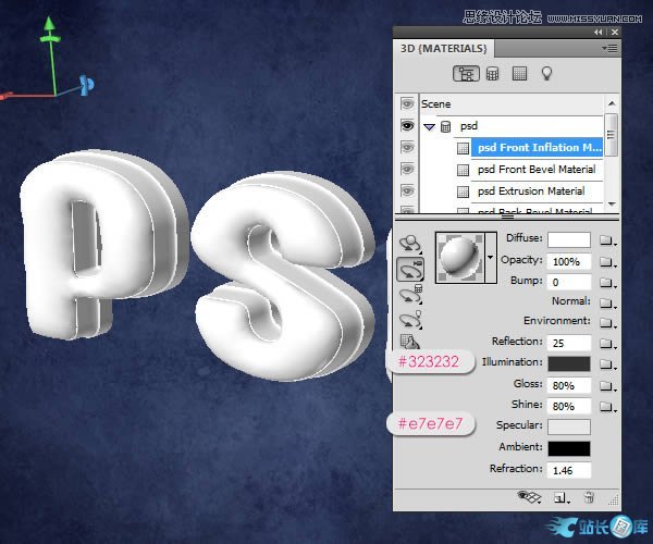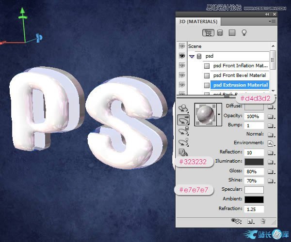 选择挤压材料,然后改变漫反射颜色为#d4d3d2,使用环境,背景虚化的纹理改变反射到10,照明的颜色为#323232,发光,80%,70%的服务,镜面颜色#e7e7e7,折射1.25。
