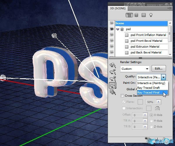点击场景在3D面板的顶部,然后选择"光线跟踪最终从品质下拉菜单。