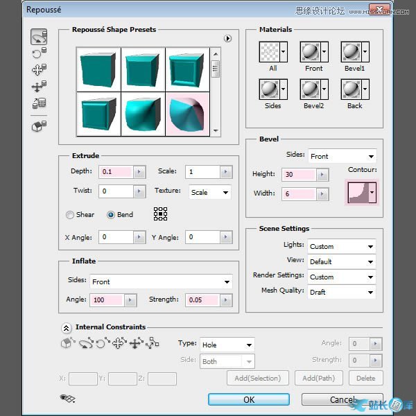 根据凸纹形状预设,选择充气边。然后,根据拉伸改变深度为0.1,下充气,改变角度为100,强度为0.05,伞下,从侧面下拉菜单选择正面,设置高度为30,宽度为6,并选择湾 - 深轮廓。