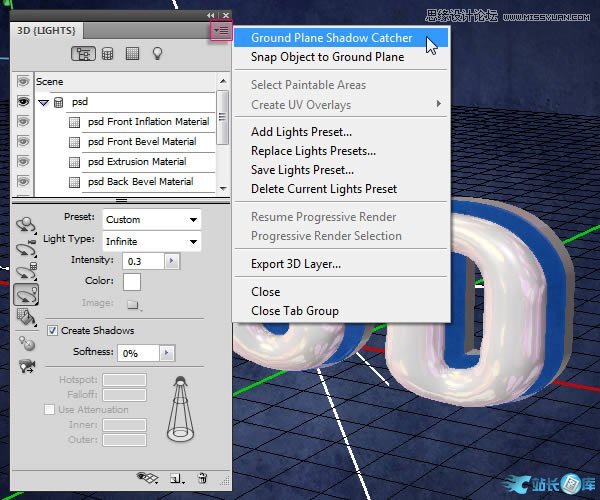 单击弹出菜单中的3D面板右上角的箭头,然后单击地面平面暗影守望者的选项,这样的阴影将被呈现,而无需创建一个表面赶上他们。