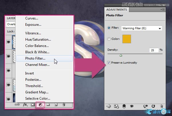 单击"创建新的填充或调整图层"图标,并选择"照片滤镜",然后选择变暖过滤器(81)。