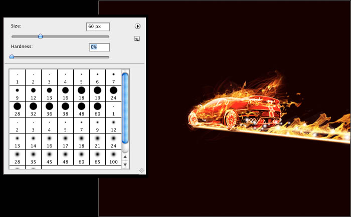 10、差不多完成了。让我们添加一些细节。添加一个新层,然后用画笔工具(B),使用0%硬度的圆形画笔来创建以下撬痕的小点的火。确保您使用不同大小的斑点像下面的图片。