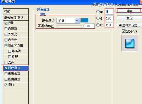 7、勾选颜色叠加选项,混合模式: 正常,点击色标处,设置光泽颜色:蓝色,设置蓝色RGB值分别为:6、130、194,设置不透明度:100%,如图7所示。