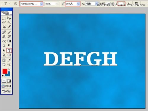 3、单击工具箱中的横排文字工具 ,输入英文字母defgh,然后在工具选项栏上设置字体:HumstSlab712 …,大小:103点,颜色:白色,设置消除锯齿的方法:锐利,如图3所示。