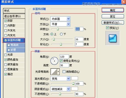 6、勾选斜面和浮雕复选项,样式:内斜面,方法:平滑,深度:300%,方向:上,大小:16像素,软化:7像素,阴影:角度:120,勾选使用全局光,高度:30度,其他设置值参考图6,如图6所示。