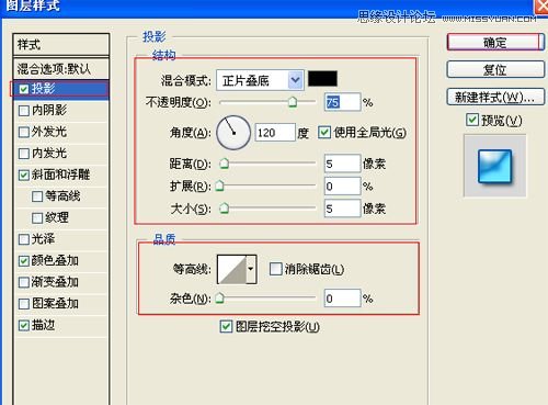 5、勾选投影,设置混合模式为:正片叠底,颜色为:黑色,不透明度为:75%,角度为:120度,勾选使用全局光,距离为:5像素,扩展为:0%,大小为:5像素,设置其他值参考图4,然后点击确定按钮,如图5所示。