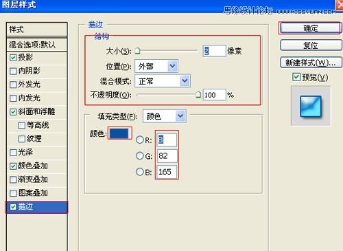 8、勾选渐变描边选项,设置大小为:2像素,位置为:内部,混合模式为:正常,不透明度为:100%,填充类型为:颜色,颜色RGB值分别为:8、82、165,如图8所示。效果如图9所示。