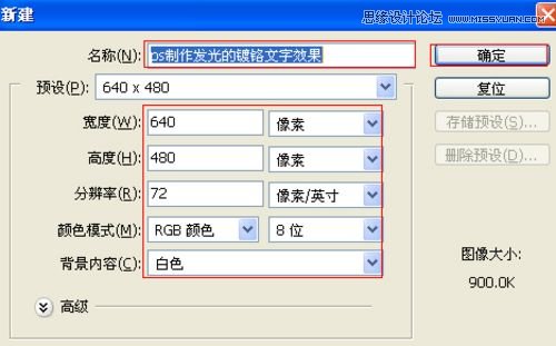 1、选择"文件/新建"菜单,打开"新建"或者Ctrl+N对话框 名称为:ps制作发光的镀文字效果,宽度:为640像素, 高度:为480像素, "分辨率"为72 ,"模式"为RGB颜色的文档,如图1所示。