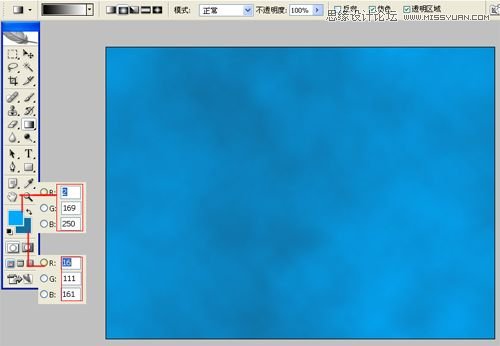 2、在工具栏中分别设置前景色和背景色的RGB值,设置前景色的RGB值为:2、169、250,设置背景色的RGB值为:16、111、161,按键盘快捷键Ctrl+Delete填充,并执行菜单:"滤镜"/"渲染"/"云彩",如图2所示。