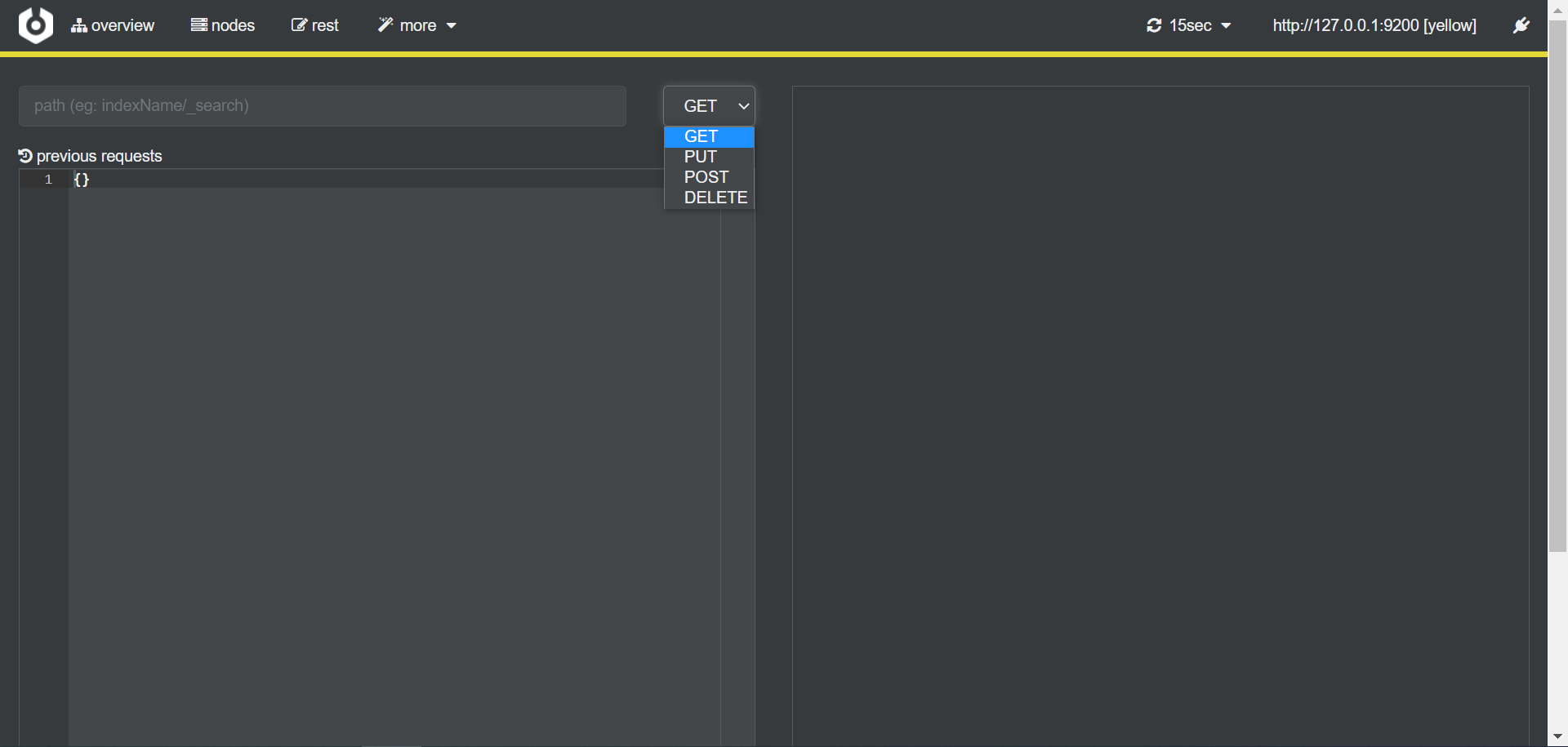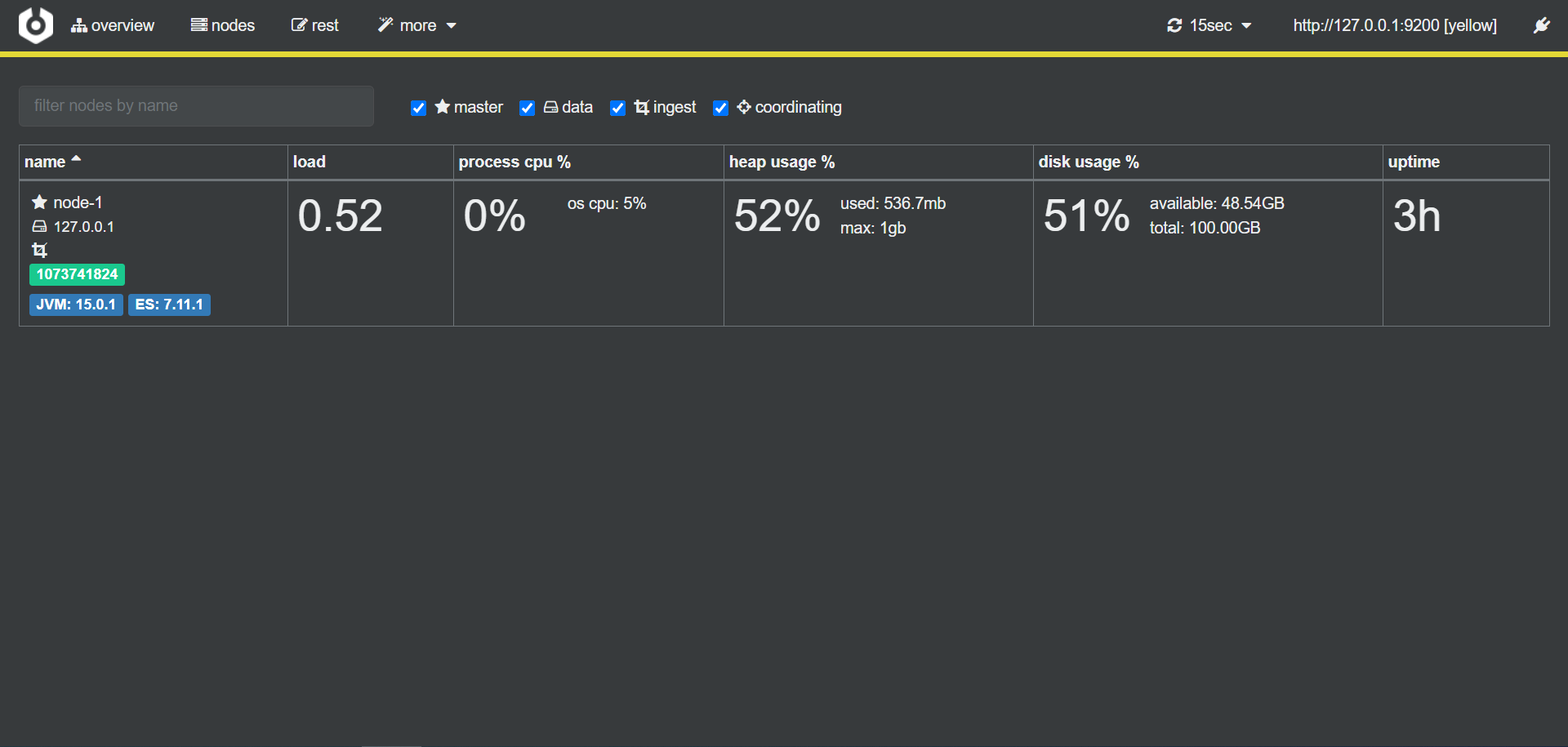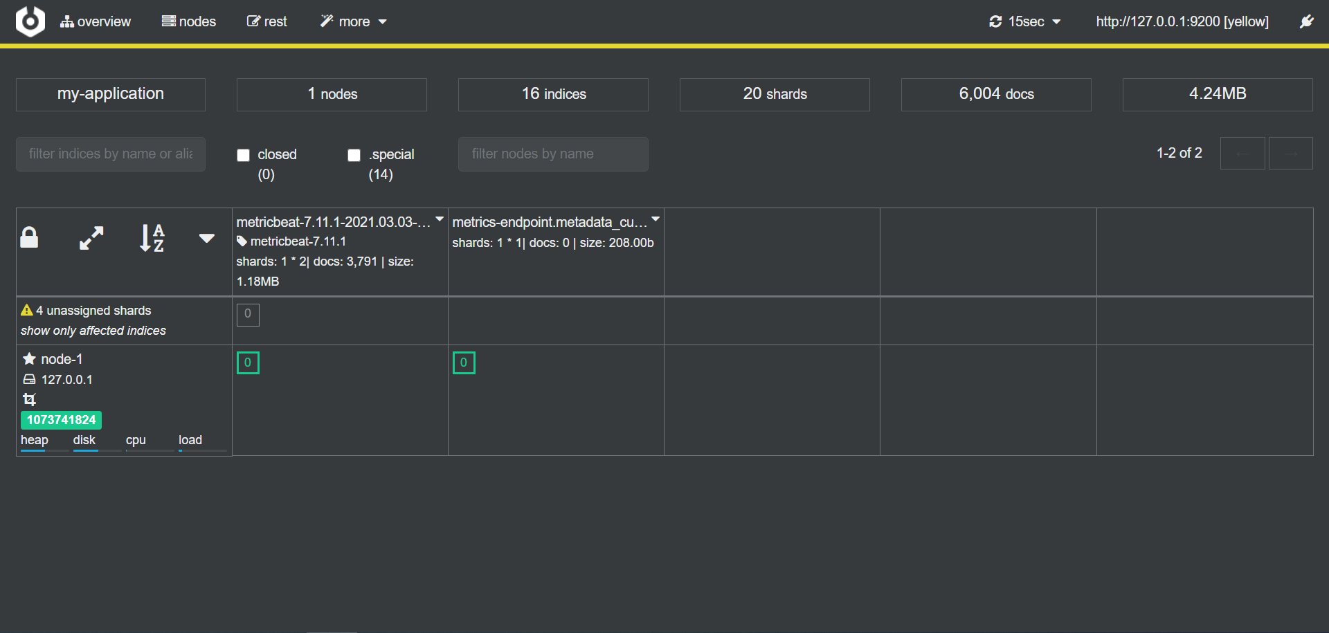 首页,状态栏为黄色,表示需要更多的节点来分别我们的 shard。