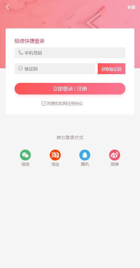 手机app通用的输入手机号码获取验证码登录表单页面模板。支持其它登录方式,微信、淘宝、腾讯、微博等快捷登录功能。这是一款jQuery制作手机号码和获取验证登录表单验证代码。