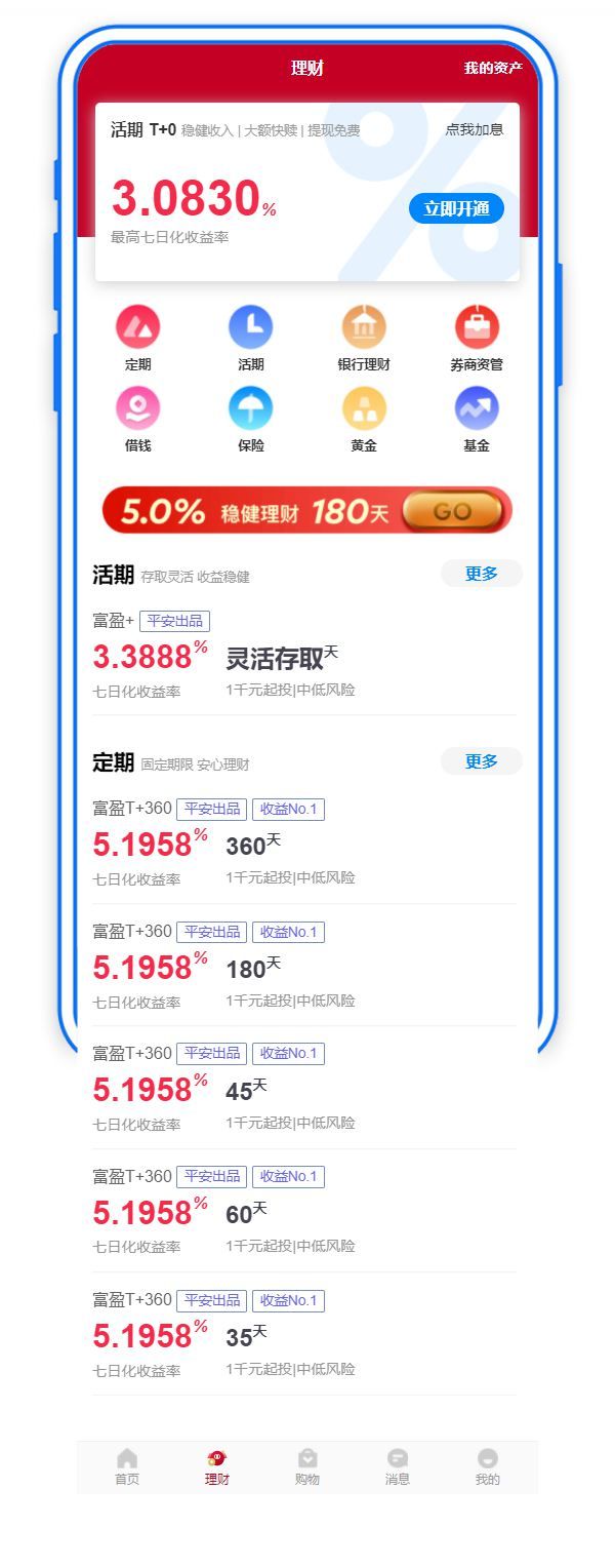 手机在线理财app产品列表页面模板。定期、活期、银行理财、券商资管、借钱、保险、黄金、基金等。